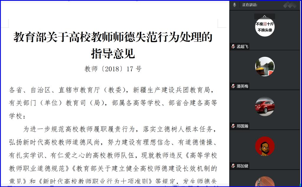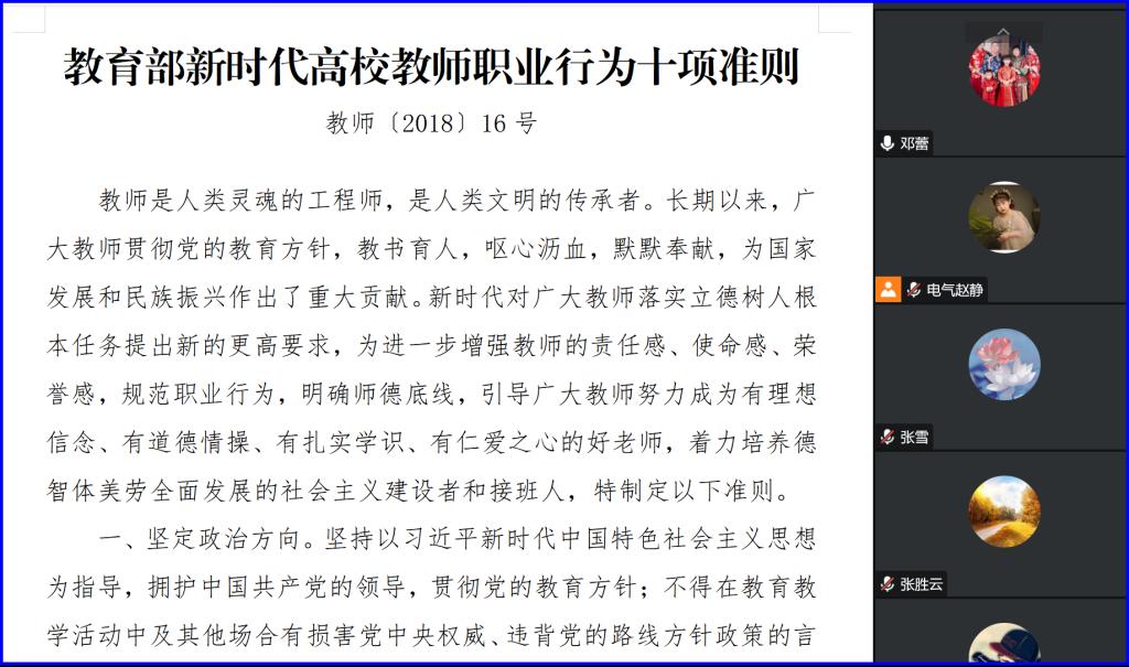 通过学习《教育部新时代高校教师职业行为十项准则》、《yl6809永利集团教师职业行为准则》等文件,反映学校对进一步规范教师履职履责行为,落实立德树人根本任务,弘扬新时代教师道德风尚,努力建设有理想信念,有道德情操、有扎实学识、有仁爱之心的教师队伍的坚定信念,对师德违规问题“零容忍”,严肃惩处,“一票否决”的鲜明态度和坚定决心。各位老师通过交流研讨进行自查自纠,自警自省。会后,各位老师对学习及研讨内容进行了认真地总结,纷纷表示要坚守立德树人初心,坚持以德立身、以德立学、以德施教,做党和人民满意的“四有”好老师。