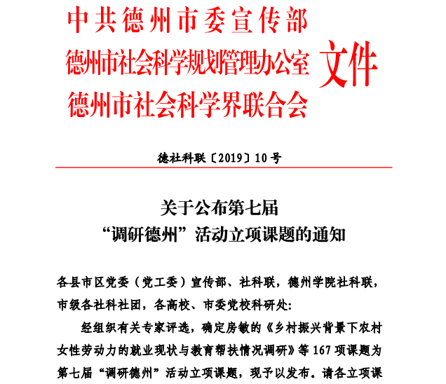 近期,德州市社科联发布了《关于公布第七届“调研德州”活动立项课题的通知》(德社科联[2019]10号)文件,全校共有51项课题获批立项,其中我院孙乐乐老师主持的《坚持我国宗教中国化方向问题研究》(课题编号:2019DYDZ-104)等4项课题获批立项。