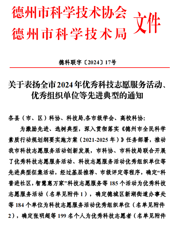 近日,德州市科学技术协会、德州市科技局发布“关于表扬全市2024年优秀科技志愿服务活动、优秀组织单位等先进典型的通知”,我院被评为科技志愿服务活动优秀组织单位。