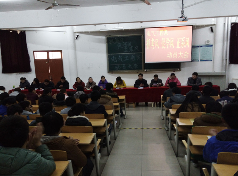 依据学院“抓考风、促学风、正校风”活动的总体安排,电气工程系于2015年1月7日下午在10号楼F101召开了电气工程系“抓考风、促学风、正系风”主题活动学生动员会,系主任王平、教学主任助理马叶革、学生教育管理主任助理王东盈、各教研室主任和全体辅导员及200余名学生代表参加了会议。会议由学生管理副科长李俊老师主持,学管主任助理王东盈老师宣读了电气工程系“抓考风、促学风、正系风”主题活动实施方案,系主任王平副教授做了“抓考风、促学风、正系风”主题活动学生动员报告。