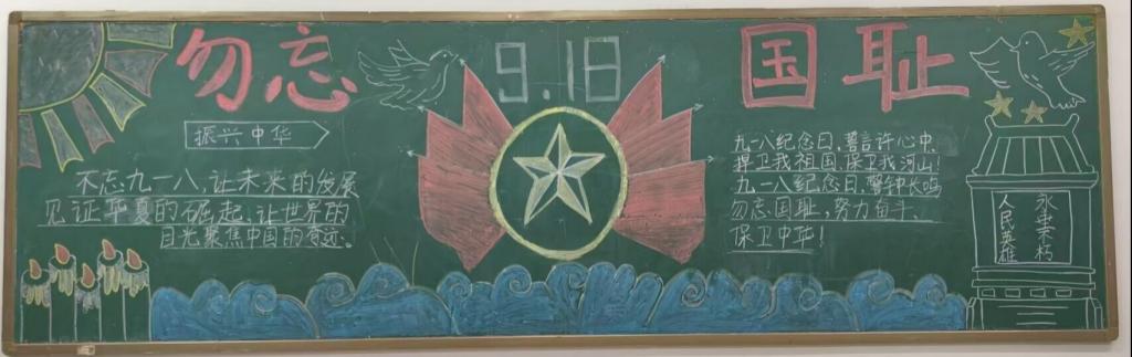 其次开展一次黑板报评选,激发同学们的爱校、荣校的责任感,展现校园文化风采,彰显学生个性,各班级团支部组织参加“勿忘国耻 砥砺前行”——纪念“九一八事变””主题团日黑板报评选。