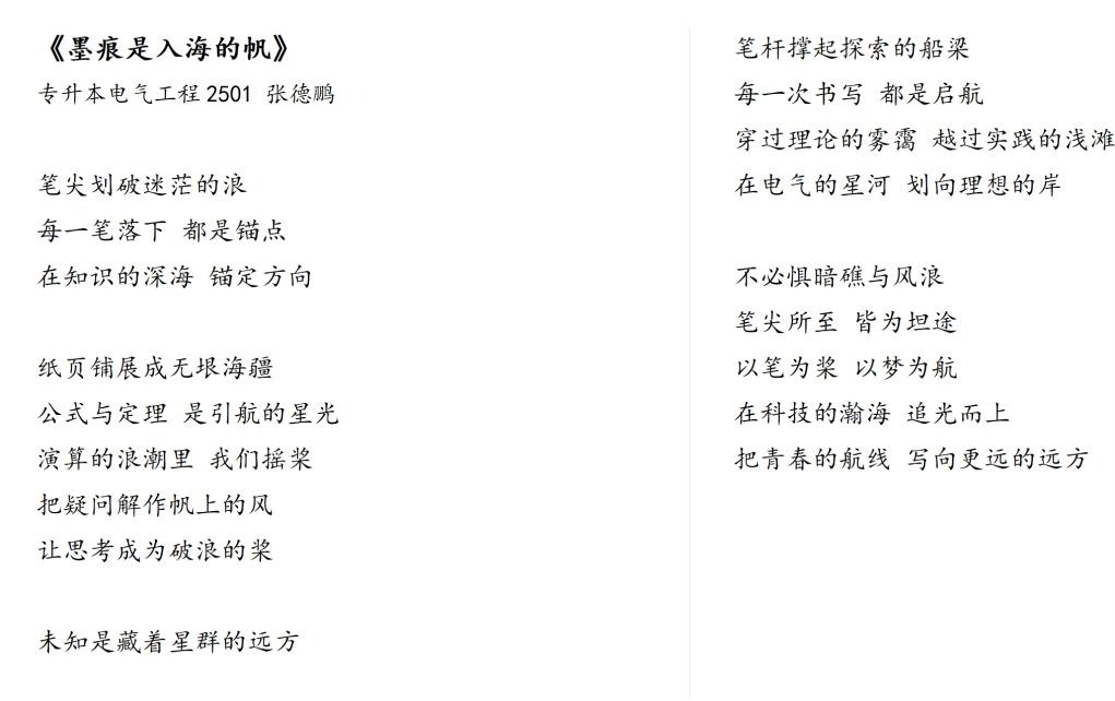为深入落实“坚定文化自信,加强社会主义先进文化教育”的要求,积极响应学校“创新创业、沟通表达”等人才观培养理念,yl6809永利官网集团养成教育自治委员会于2025年11月24日至28日举办“以笔为桨・向未知远航”第四期校园诗歌创作活动。