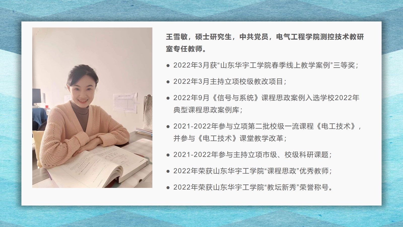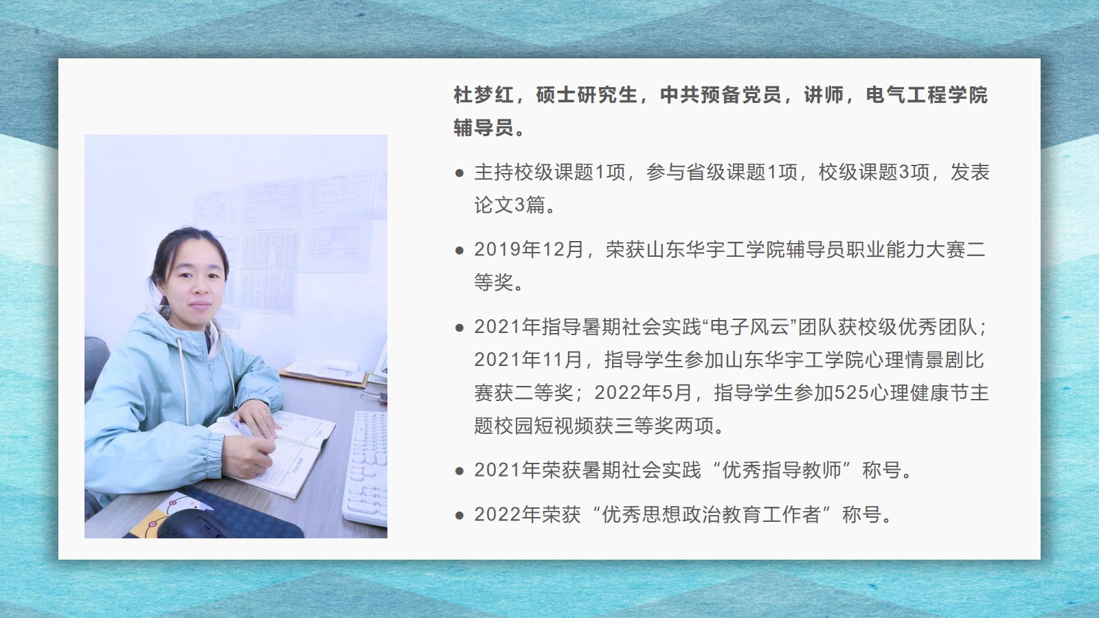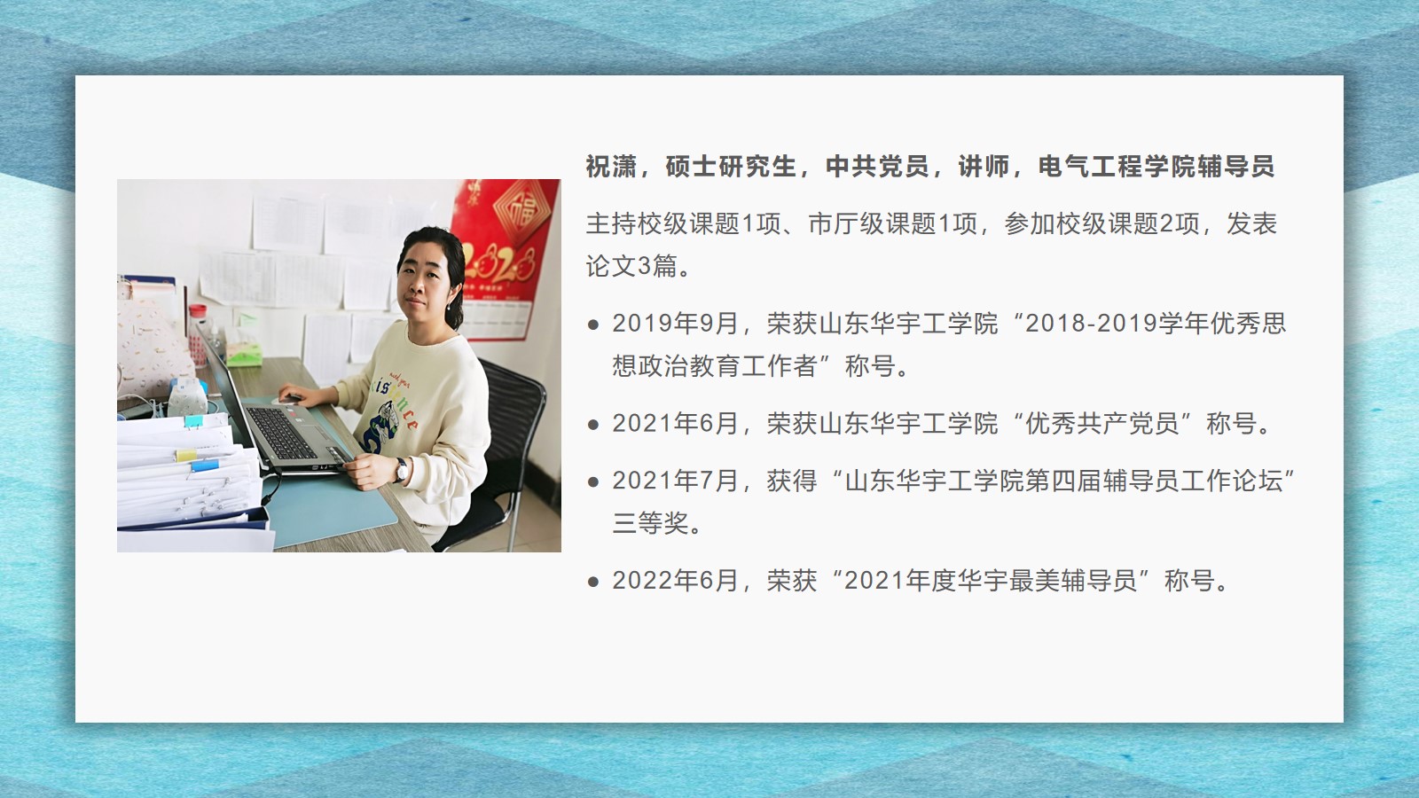 2021-2022学年,yl6809永利官网集团坚持全面落实“立德树人”,在教学、科研、学生管理等方面,取得了较好的成绩,学院荣获yl6809永利集团先进集体荣誉称号。为了弘扬尊师重教的良好风尚,学院通过校园网、微信公众号等宣传平台,宣传了2021 年度华宇最美教师(辅导员)、2021—2022 学年“课程思政”优秀教师、2021—2022 学年“四有”好老师、优秀青年教师、优秀思想政治教育工作者等先进个人的典型事迹,充分发挥榜样的引领作用,引导全院教师坚定理想信念、厚植爱国情怀、涵养高尚师德,激励教师踔厉奋发、笃行不怠,以更加坚定的信心和更加饱满的热情投入到教书育人的工作中。